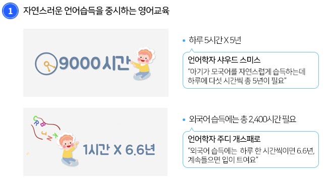 3. 교사의 영어구사력이 뛰어나고 소인수 학급이라 개별 맞춤 수업이 가능하다. [많은 노출과 사용의 기회]