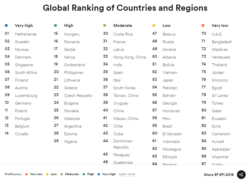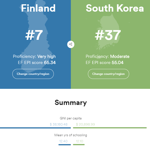 핀란드의 영어능력지수는 2019년도 기준 7위이다. 그에 반해 대한민국은 37위이다. 영어 정규 교육시간도 크게 차이 나지 않는다(핀란드 12.4년, 대한민국 12.1년). 대한민국에선 영어 사교육이 만연함에도 불구하고 영어능력지수가 낮은 반면, 핀란드에서는 영어사교육이 별로 없는 데도 불구하고 영어능력지수가 높다.
