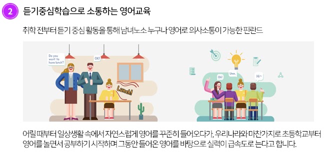 한국은 수업시간에만 영어로 진행하며 특히 교수가 주로 영어로 말하고 학생들은 주로 듣는 입장이지만 핀란드는 교수와 학생들이 토론방식으로 영어수업이 이뤄집니다.