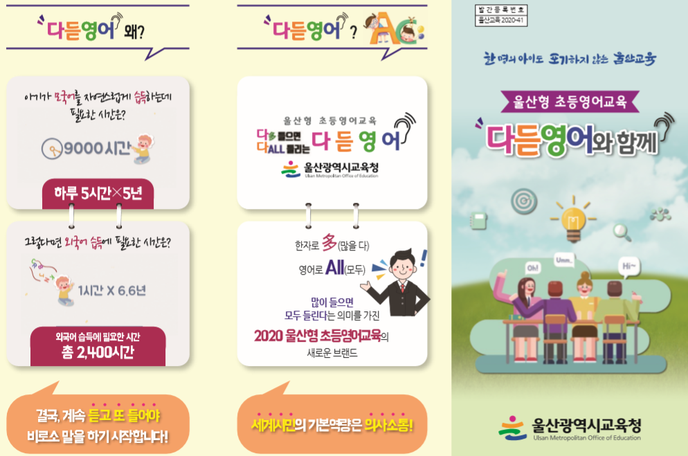 울산광역시 교육청에서 2020년에 울산형 초등영어교육으로 ‘다듣영어’를 제시하였다. 소감을 바라셔서 ‘다듣영어’에 관해 고찰해보았다.